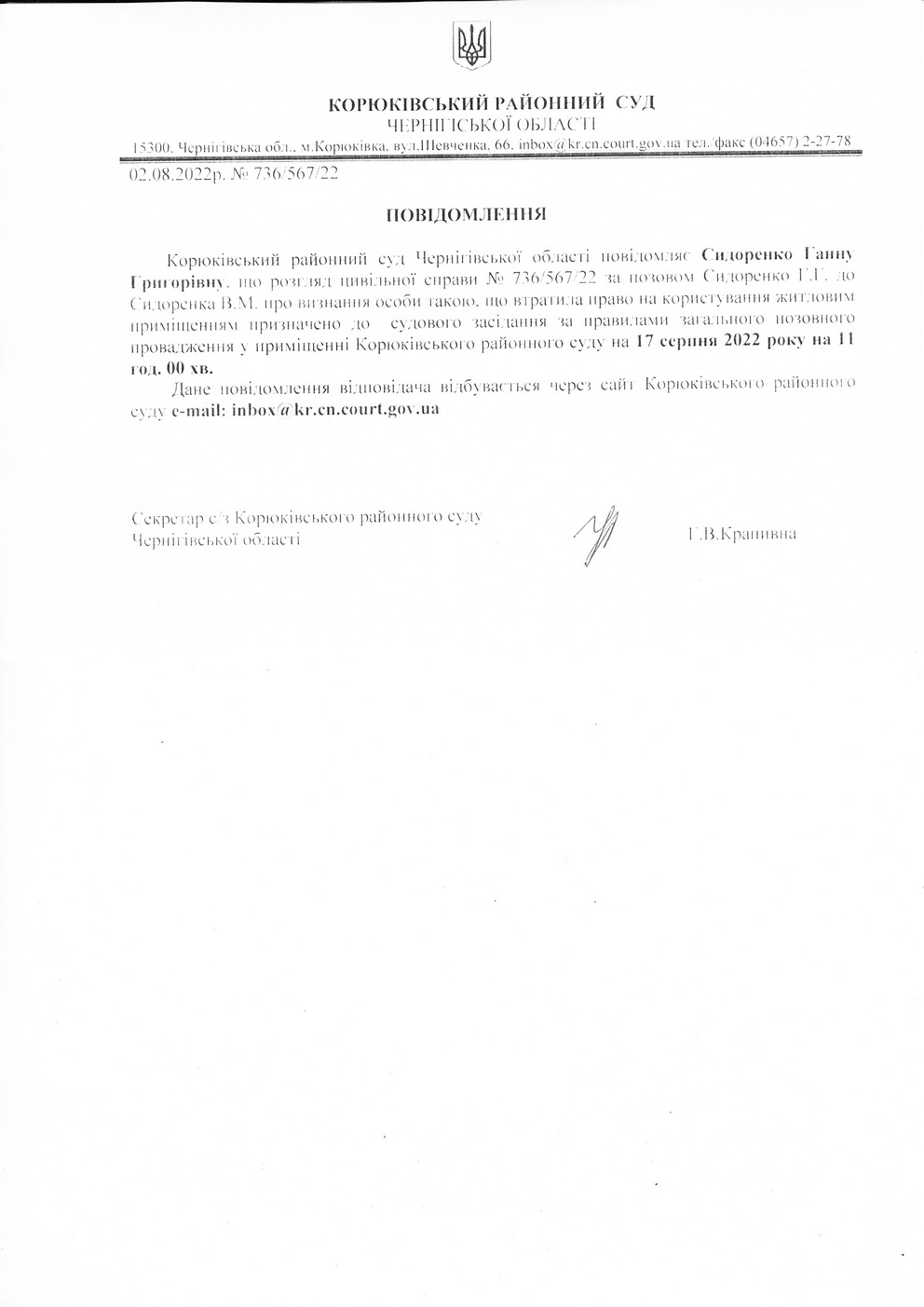 Повідомлення від 02.08.2022 про виклик до суду Сидоренко Ганну Григорівну