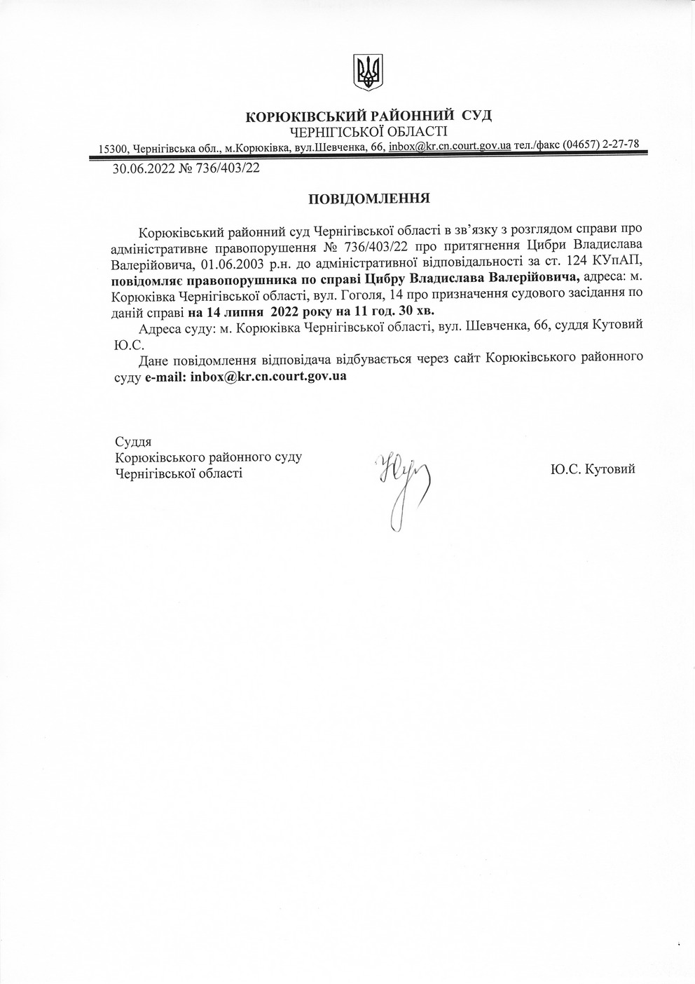 Повідомлення від 30.06.2022 про виклик до суду Цибру Владислава Валерійовича