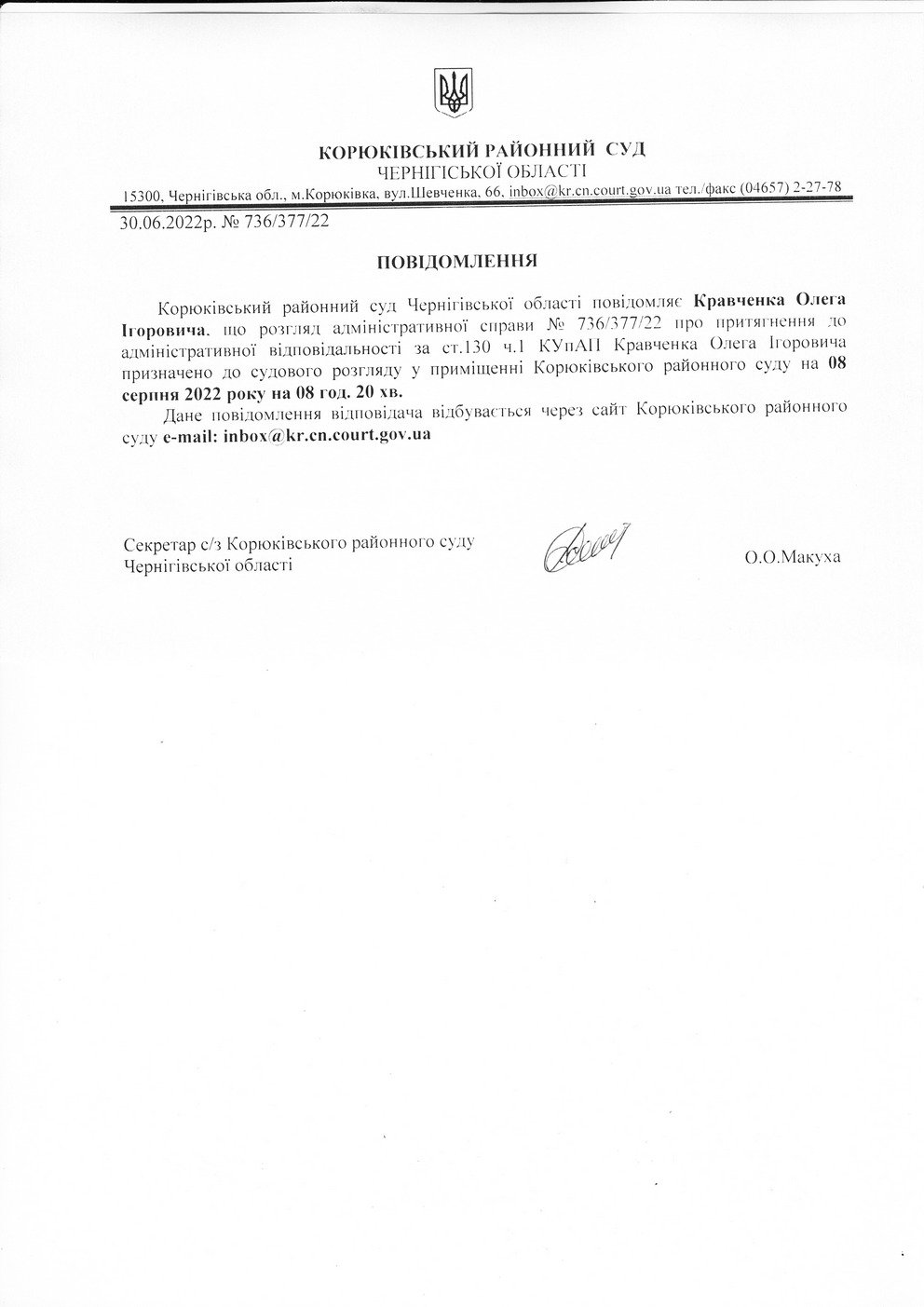 Повідомлення від 30.06.2022 про виклик до суду Кравченка Олега Ігоровича
