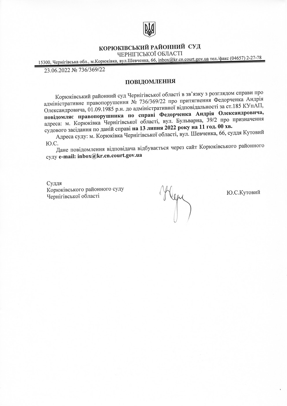 Повідомлення від 23.06.2022 про виклик до суду Федорченка Андрія Олександровича