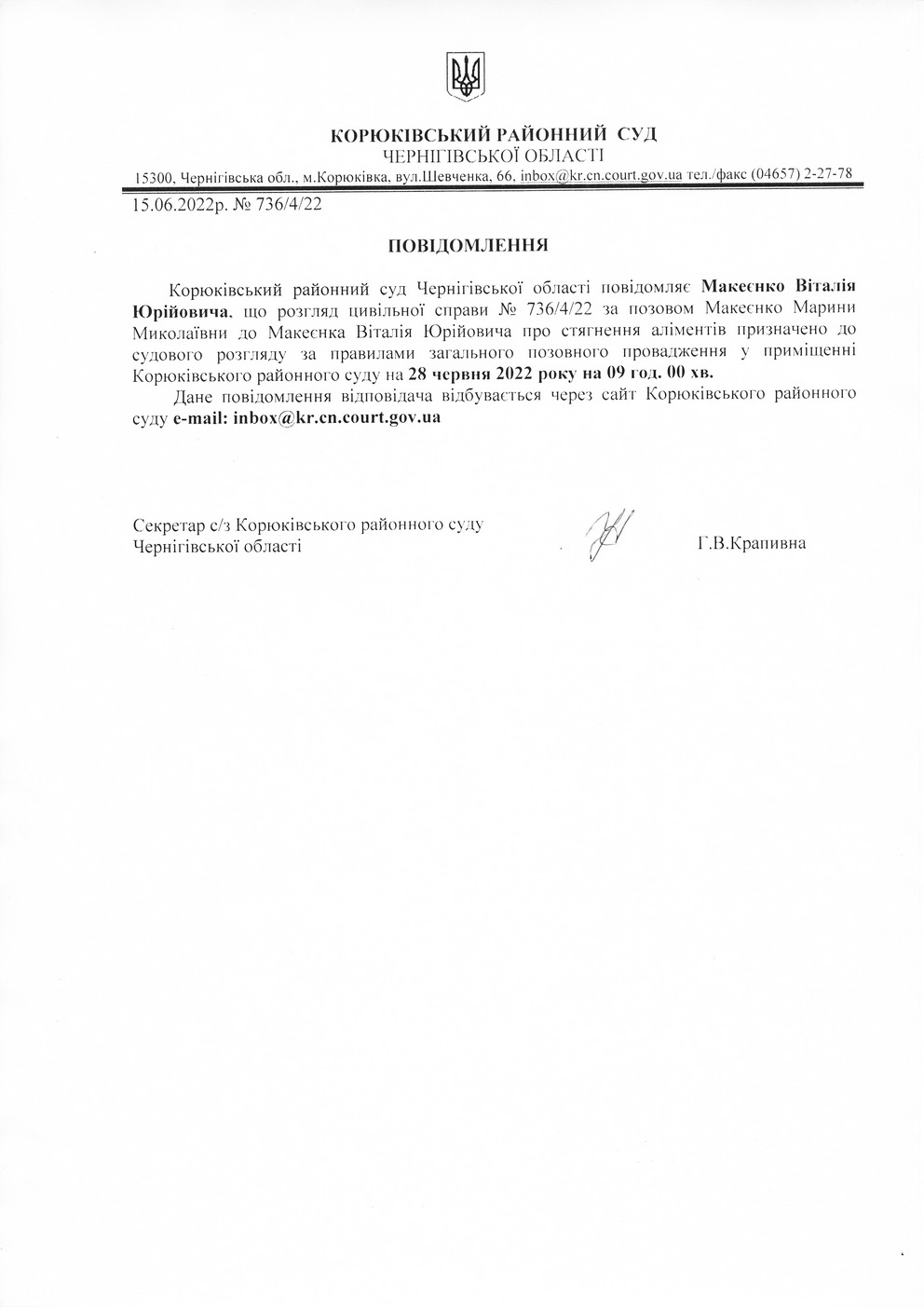 Повідомлення від 15.06.2022 про виклик до суду Макеєнко Віталія Юрійовича