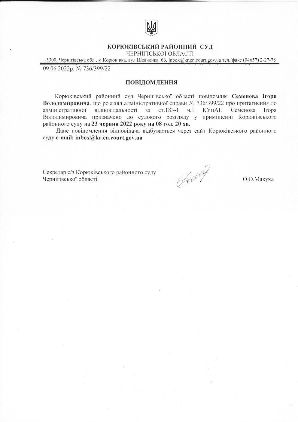 Повідомлення від 09.06.2022 про виклик до суду Семенова Ігоря Володимировича