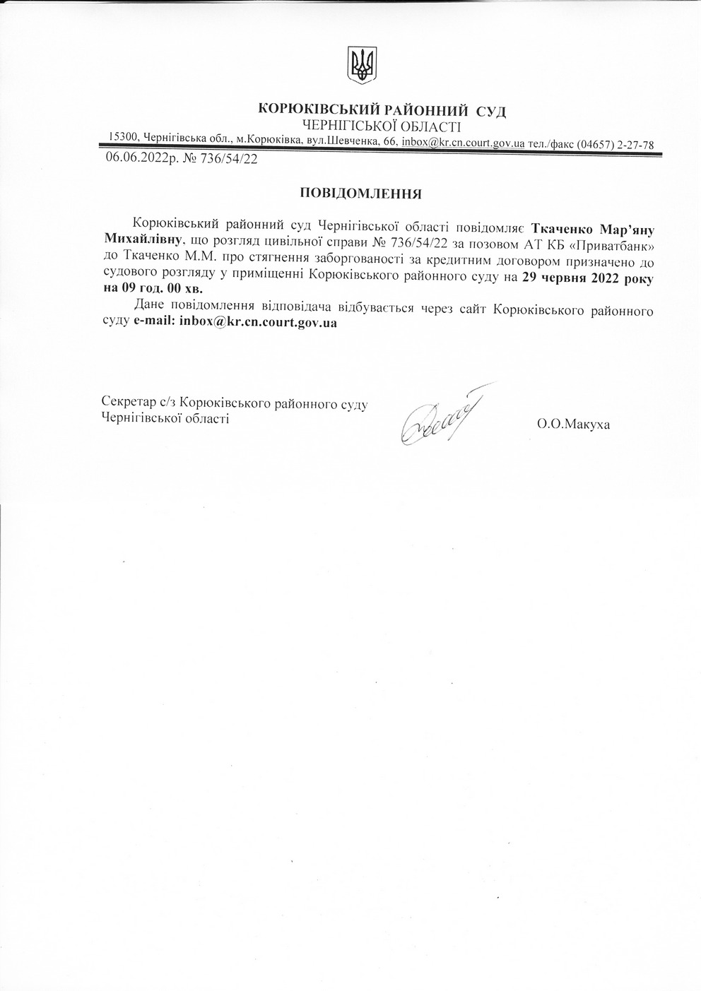 Повідомлення від 06.06.2022 про виклик до суду Ткаченко Мар'яну Михайлівну