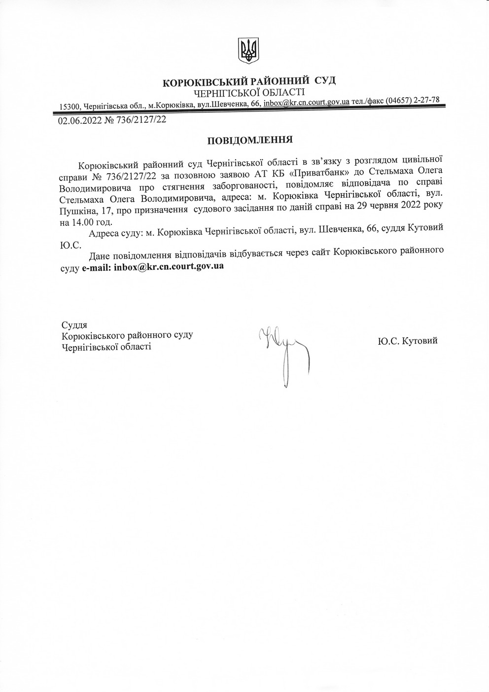 Повідомлення від 02.06.2022 про виклик до суду Стельмаха Олега Володимировича