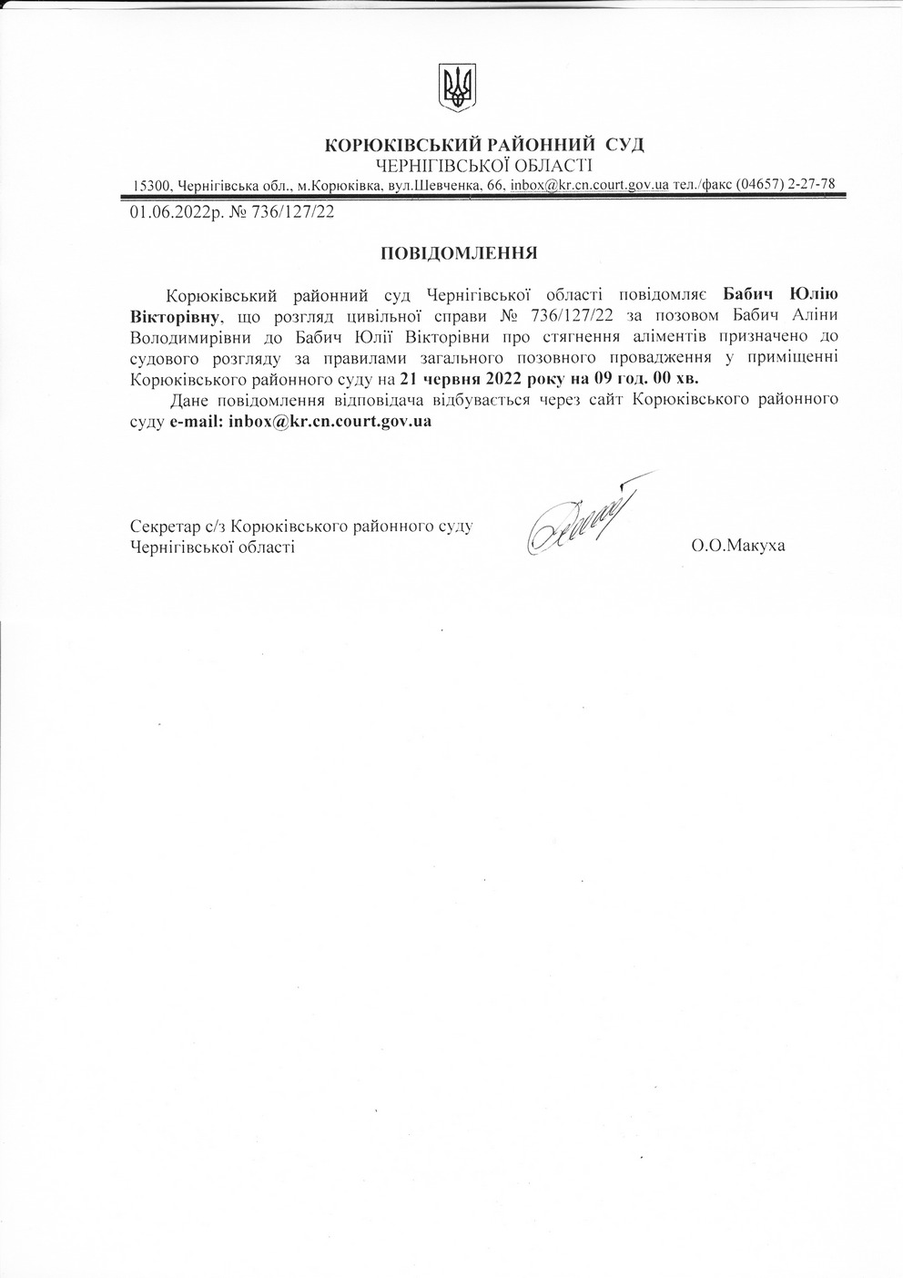 Повідомлення від 01.06.2022 про виклик до суду Бабич Юлію Вікторівну