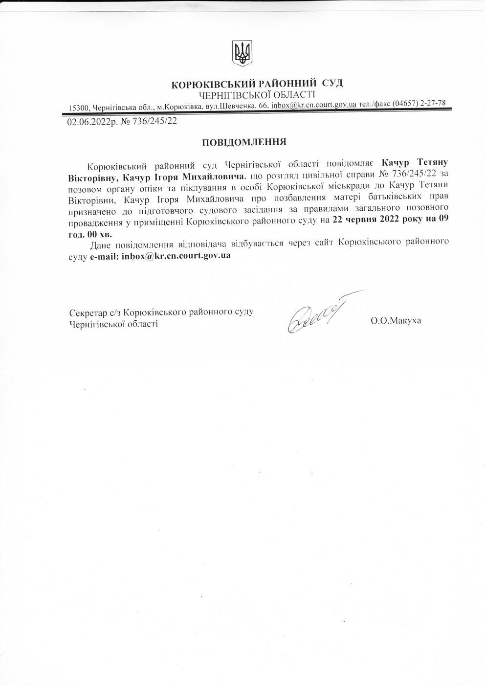 Повідомлення від 02.06.2022 про виклик до суду Качур Тетяну Вікторівну, Качур Ігоря Михайловича