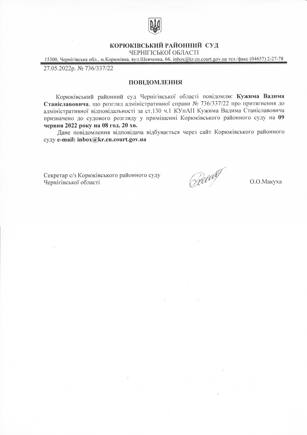 Повідомлення від 27.05.2022 про виклик до суду Кужима Вадима Станіславовича