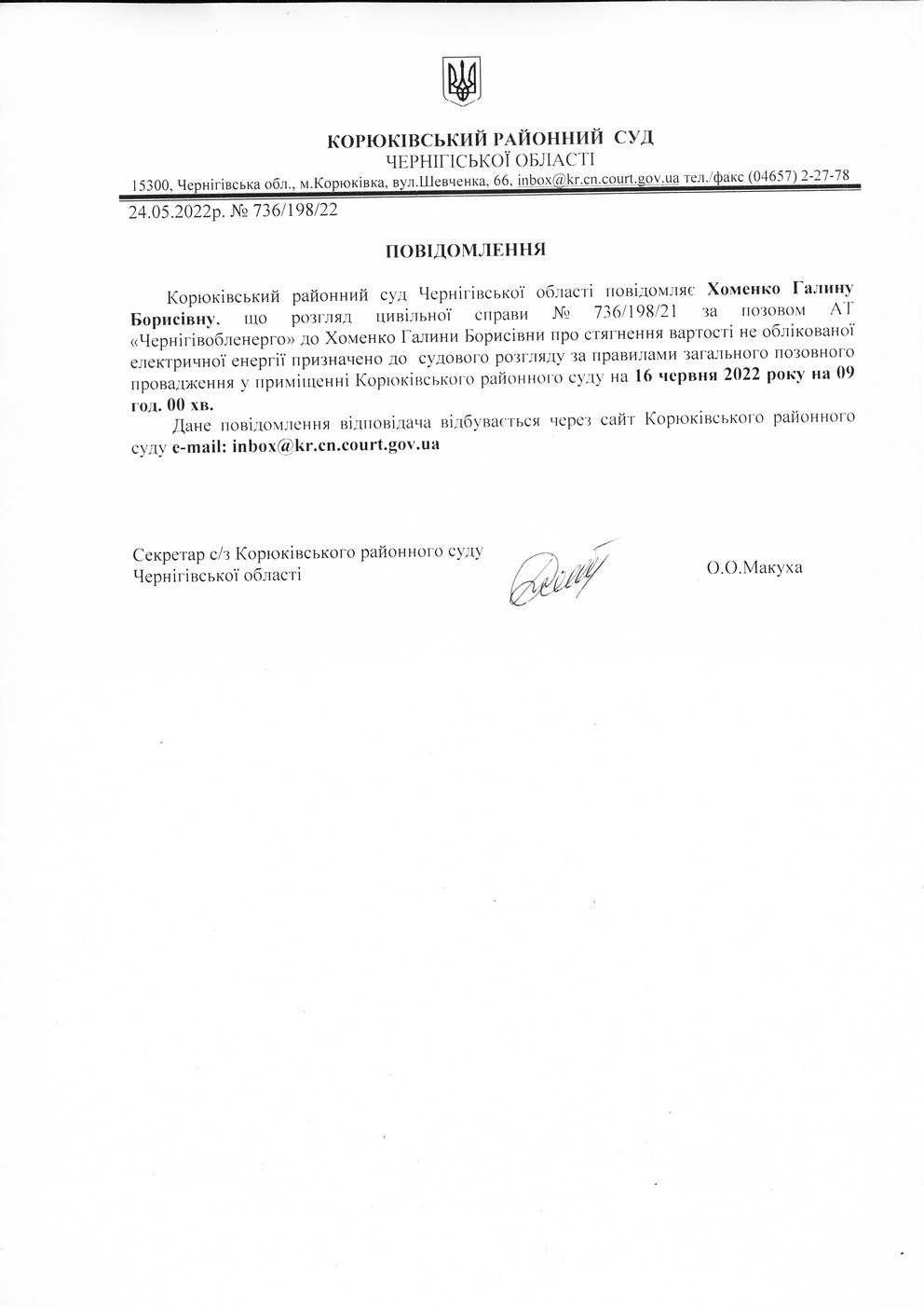 Повідомлення від 24.05.2022 про виклик до суду Хоменко Галину Борисівну