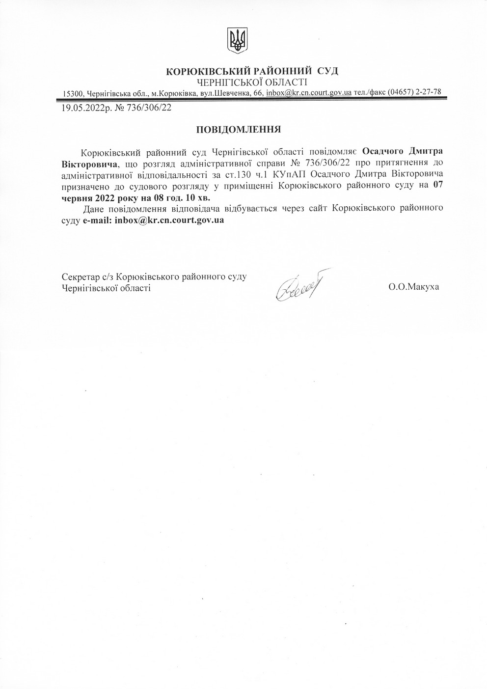Повідомлення від 19.05.2022 про виклик до суду Осадчого Дмитра Вікторовича