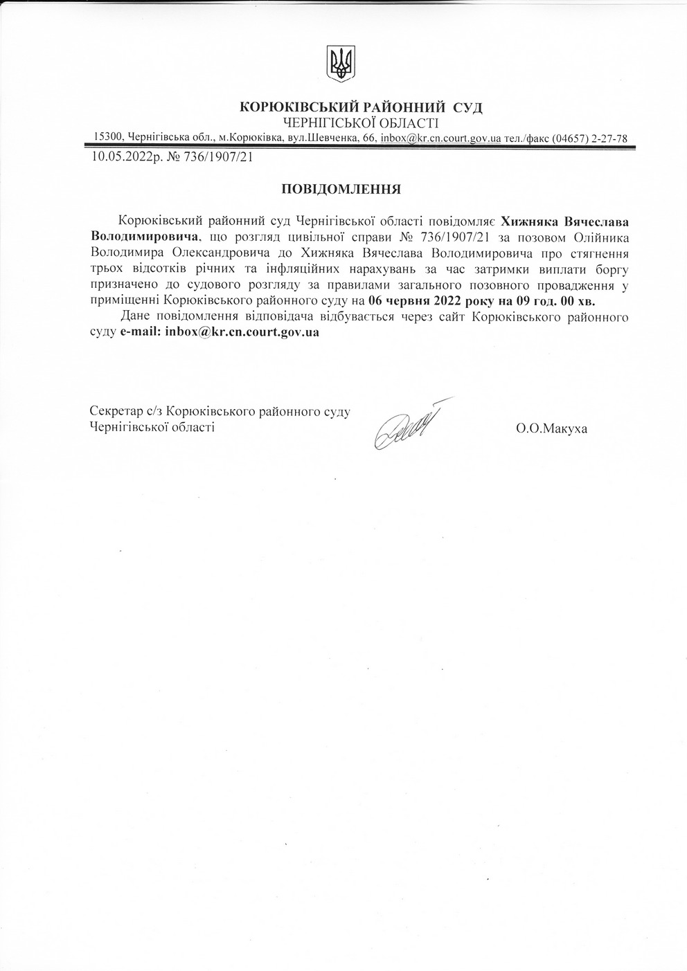 Повідомлення від 10.05.2022 про виклик до суду Хижняка Вячеслава Володимировича