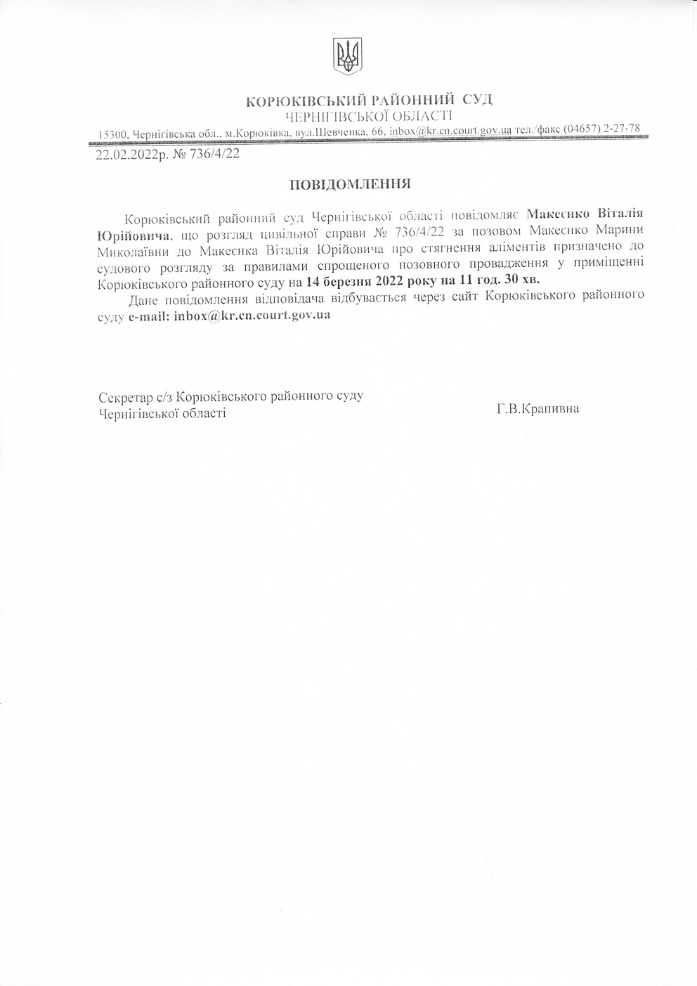 Повідомлення від 22.02.2022 про виклик до суду Макеєнко Віталія Юрійовича