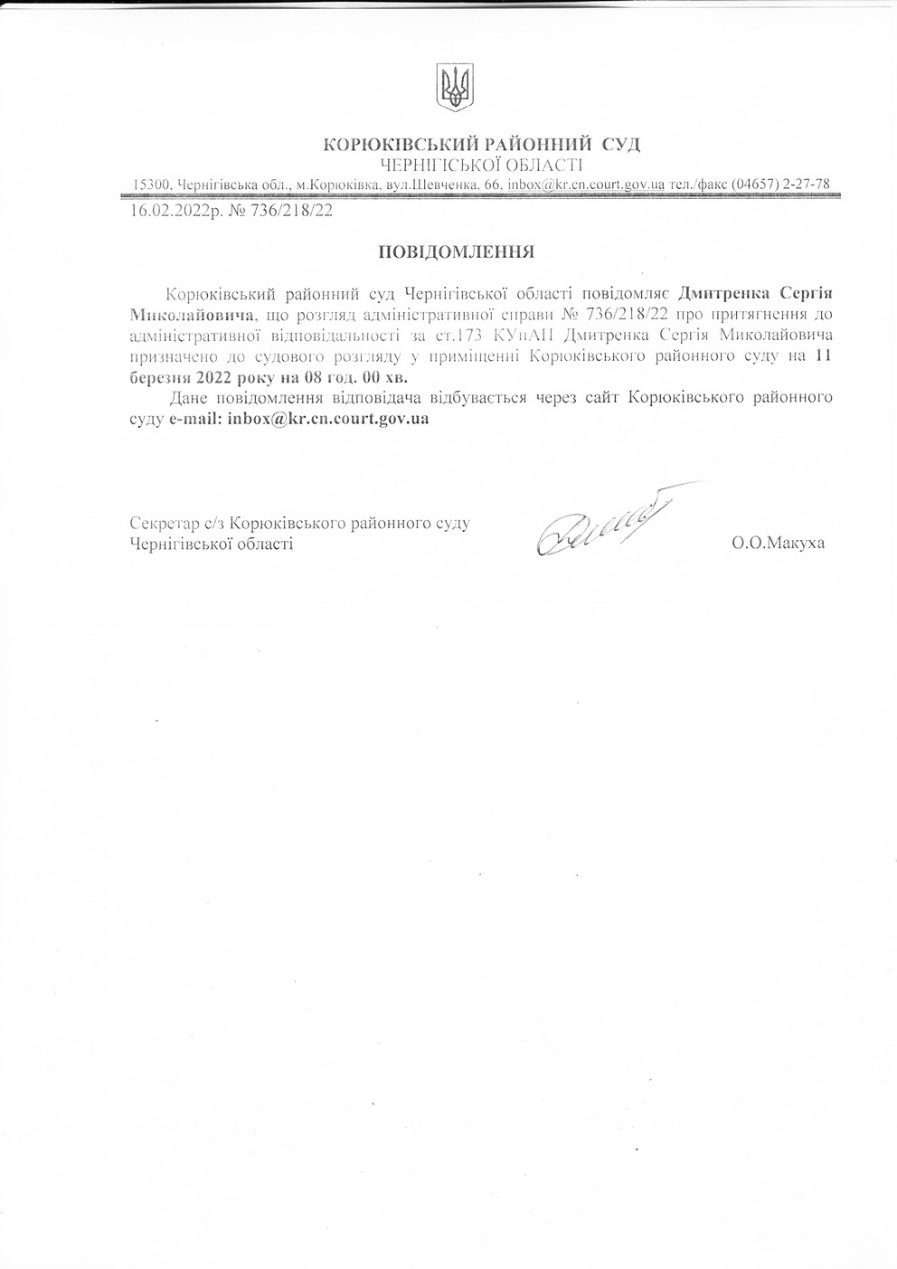 Повідомлення від 16.02.2022 про виклик до суду Дмитренка Сергія Миколайовича