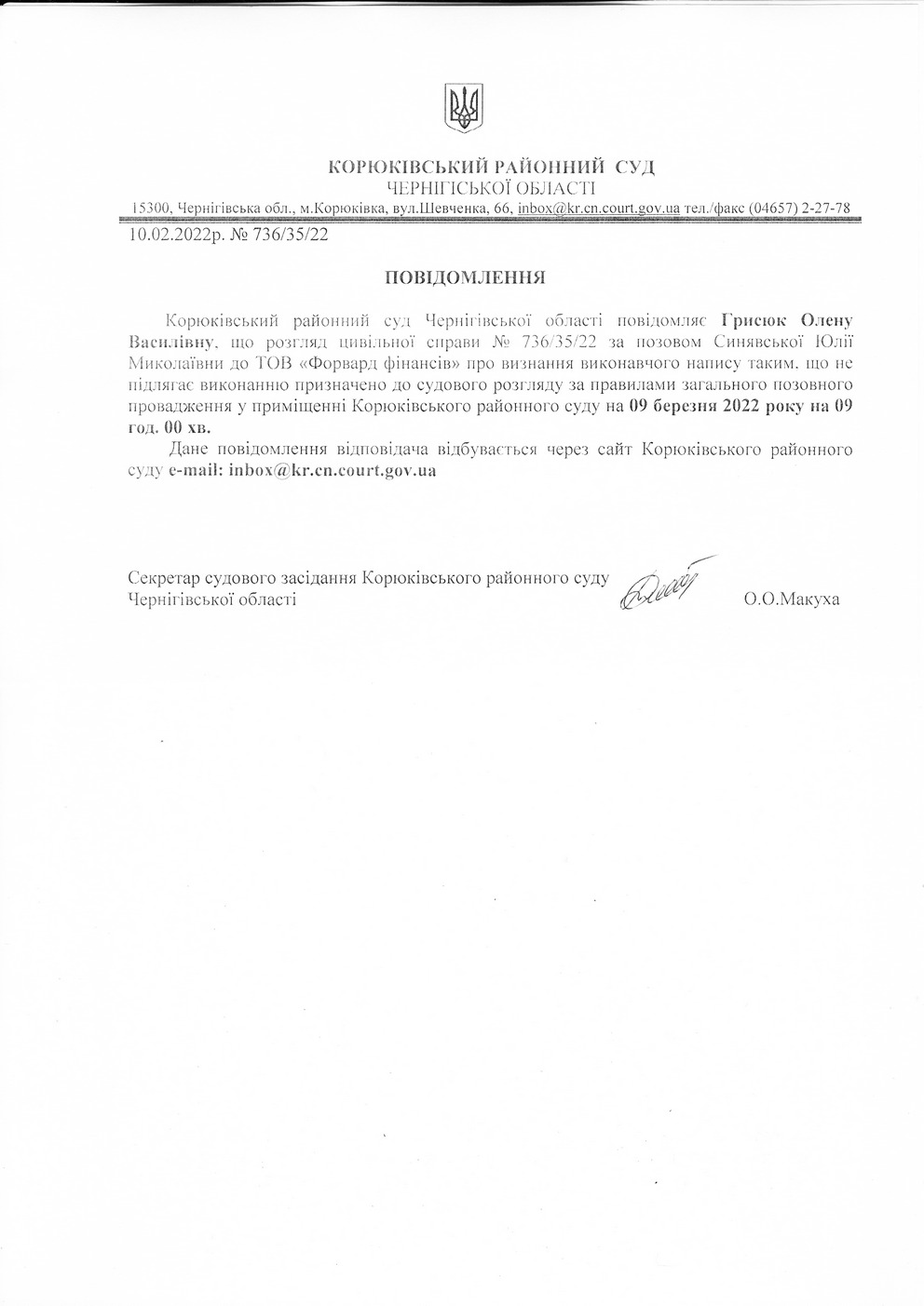 Повідомлення від 10.02.2022 про виклик до суду Грисюк Олену Василівну