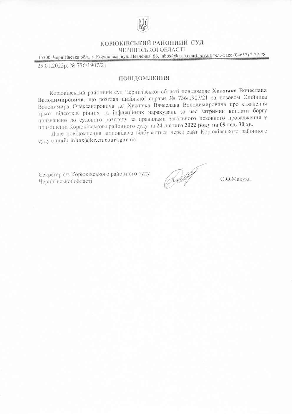 Повідомлення від 25.01.2022 про виклик до суду Хижняка Вячеслава Володимировича