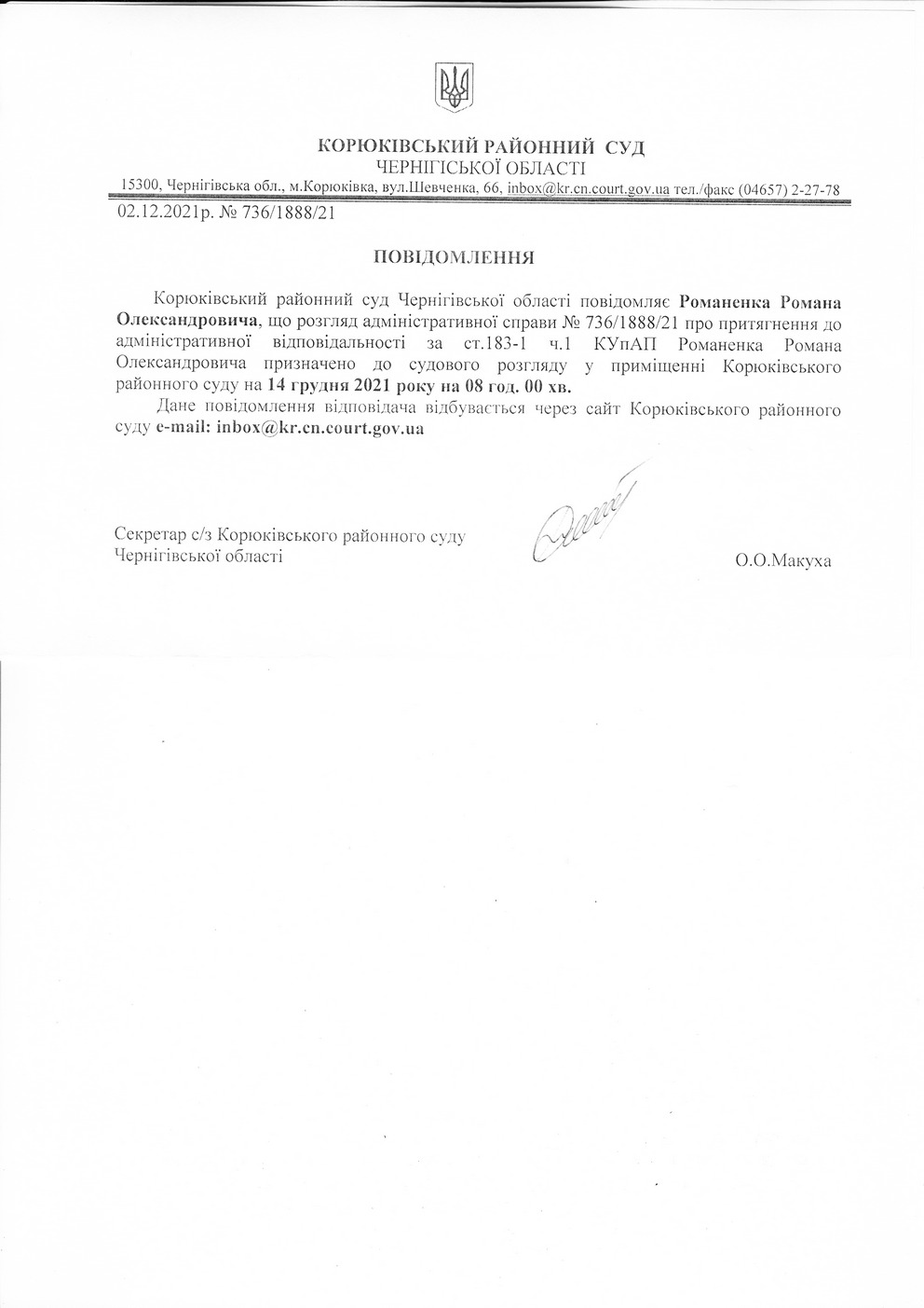 Повідомлення від 02.12.2021 про виклик до суду Романенка Романа Олександровича