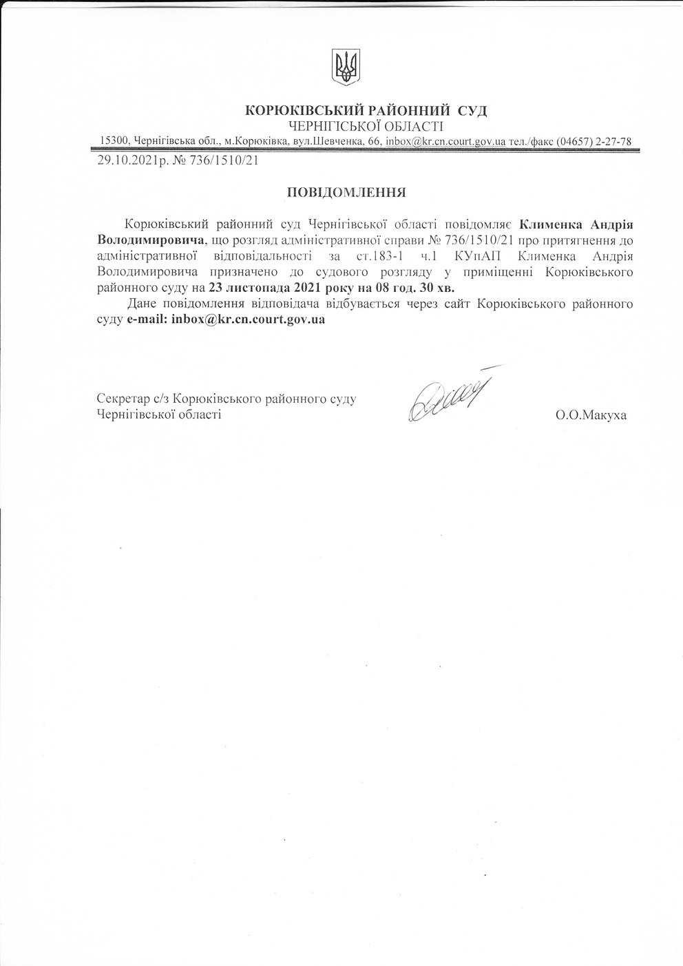 Повідомлення від 29.10.2021 про виклик до суду Клименка Андрія Володимировича