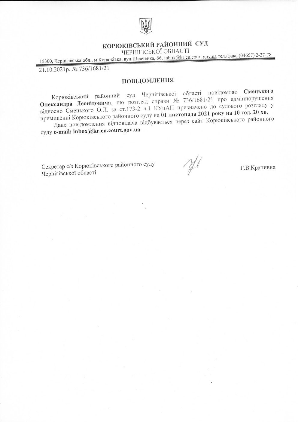 Повідомлення від 21.10.2021 про виклик до суду Смецького Олександра Леонідовича