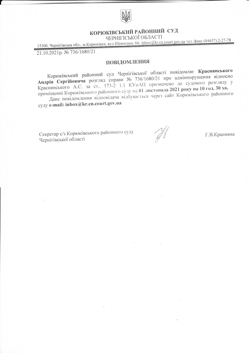 Повідомлення від 21.10.2021 про виклик до суду Краснянського Андрія Сергійовича