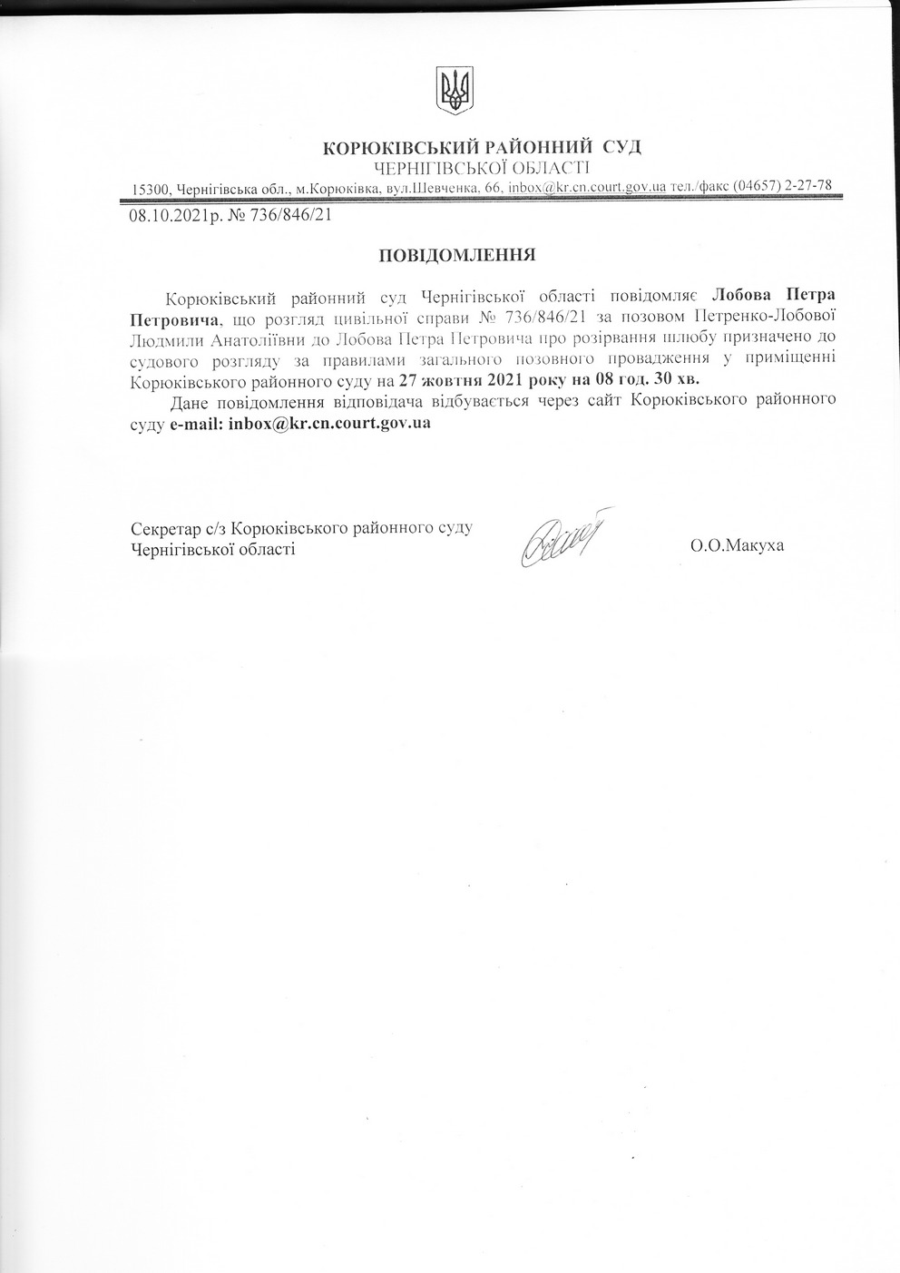 Повідомлення від 08.10.2021 про виклик до суду Любова Петра Петровича