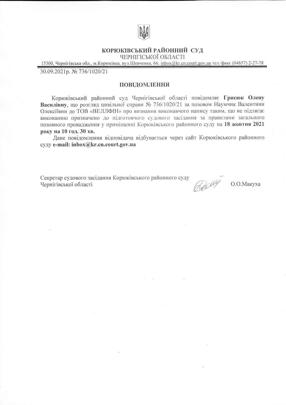 Повідомлення від 30.09.2021 про виклик до суду Грисюк Олену Василівну