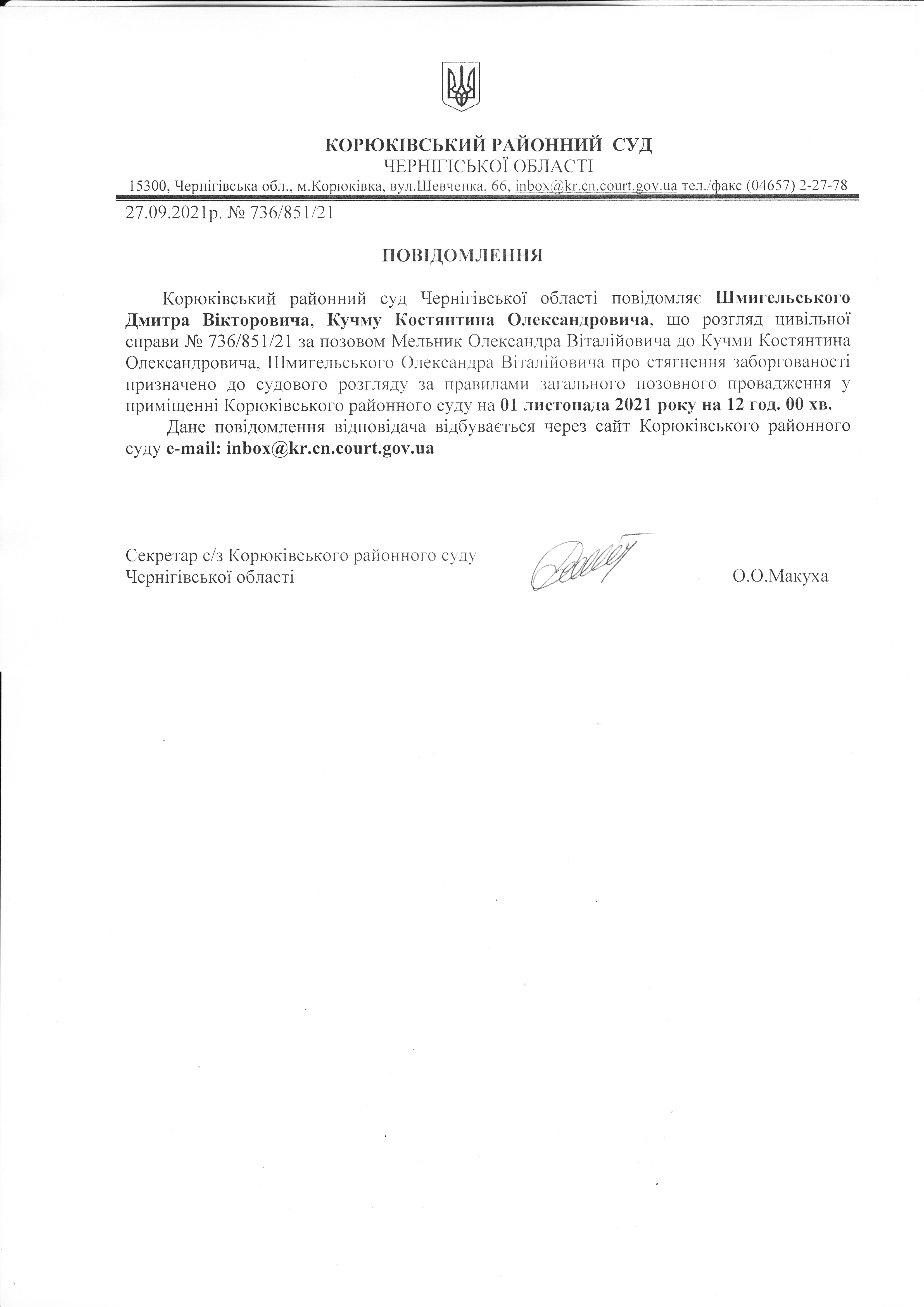 Повідомлення від 27.09.2021 про виклик до суду Шмигельського Дмитра Вікторовича, Кучму Костянтина Олександровича
