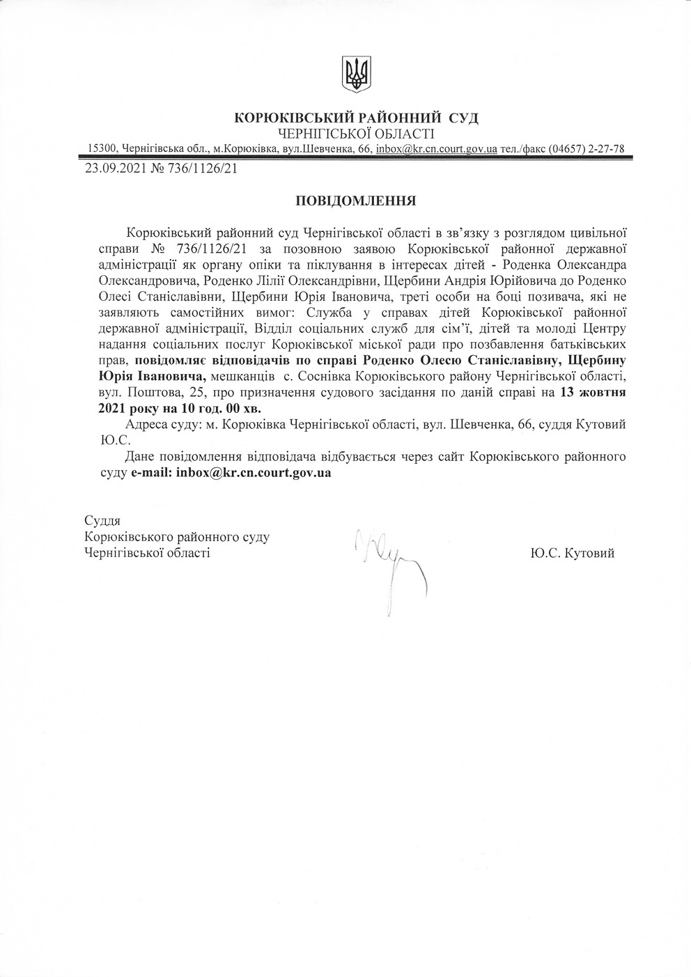 Повідомлення від 23.09.2021 про виклик до суду Роденко Олесю Станіславівну, Щербину Юрія Івановича