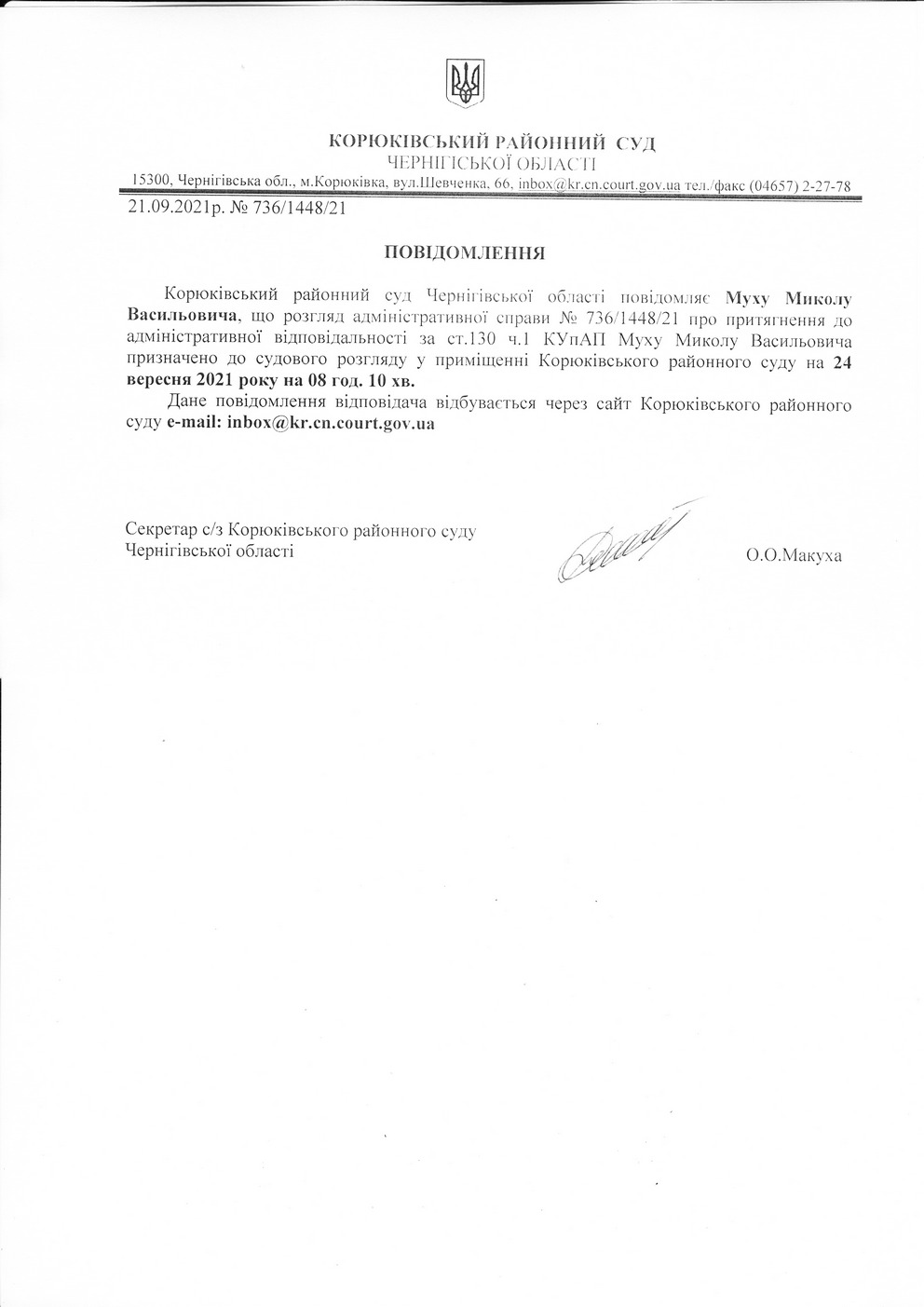 Повідомлення від 23.09.2021 про виклик до суду Муху Миколу Васильовича