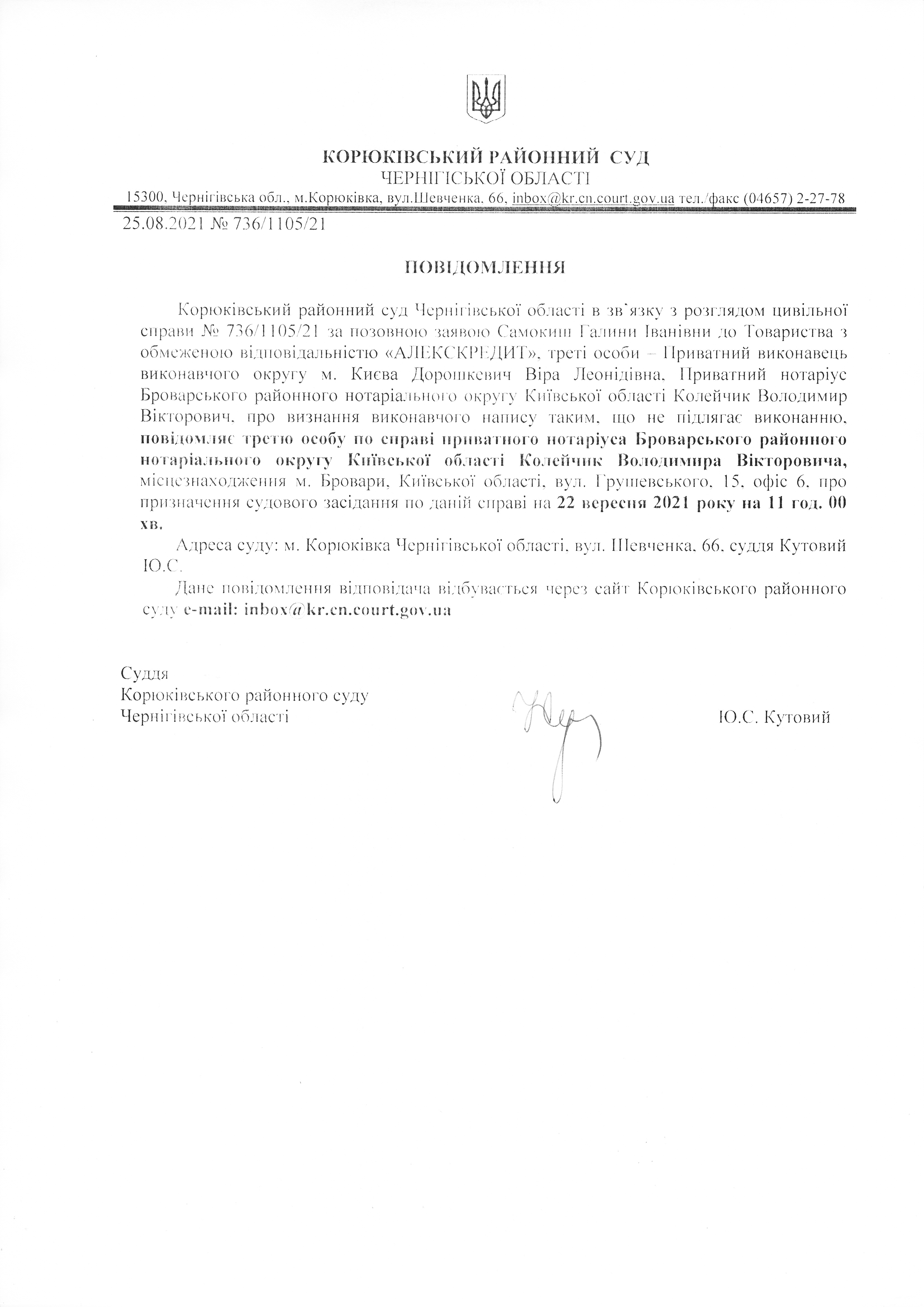 Повідомлення від 25.08.2021 про виклик до суду Колейчик Володимира Вікторовича