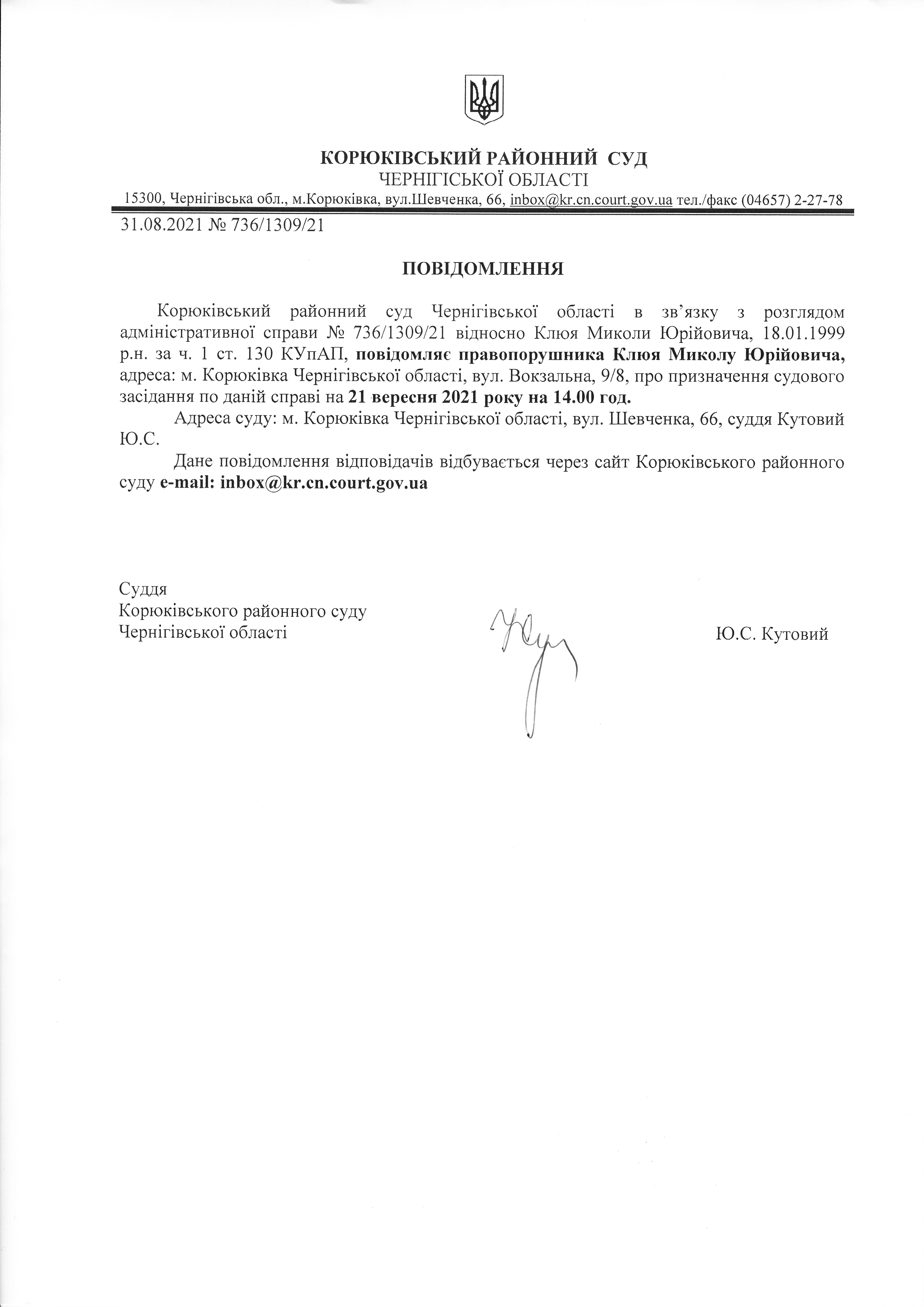 Повідомлення від 31.08.2021 про виклик до суду Клюя Миколу Юрійовича
