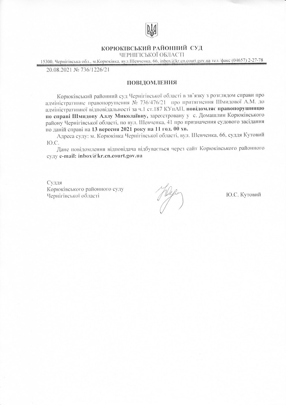 Повідомлення від 20.08.2021 про виклик до суду Шмидову Аллу Миколаївну