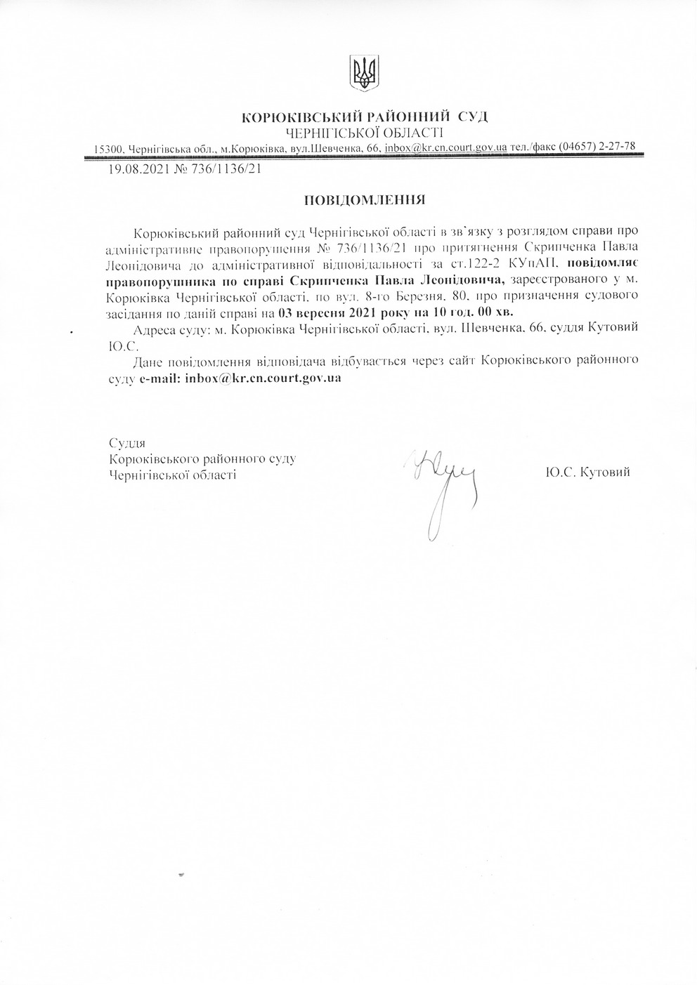 Повідомлення від 19.08.2021 про виклик до суду Скрипченка Павла Леонідовича