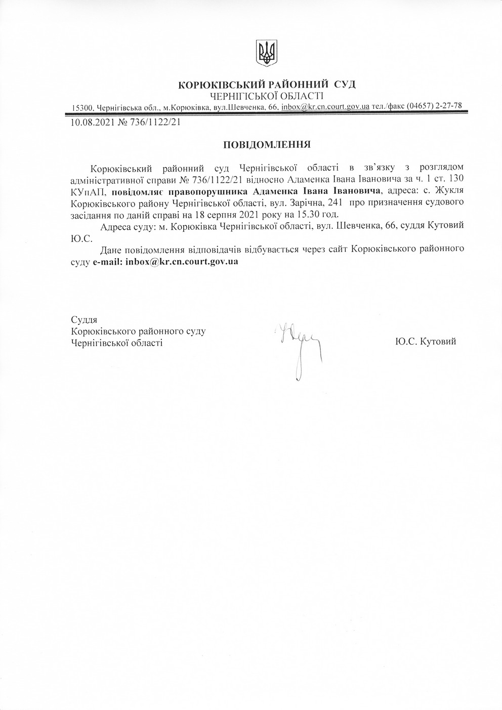 Повідомлення від 10.08.2021 про виклик до суду Адаменка Івана Івановича