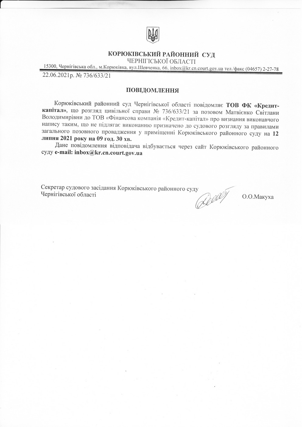 Повідомлення від 22.06.2021 про виклик до суду ТОВ ФК "Кредит-капітал"