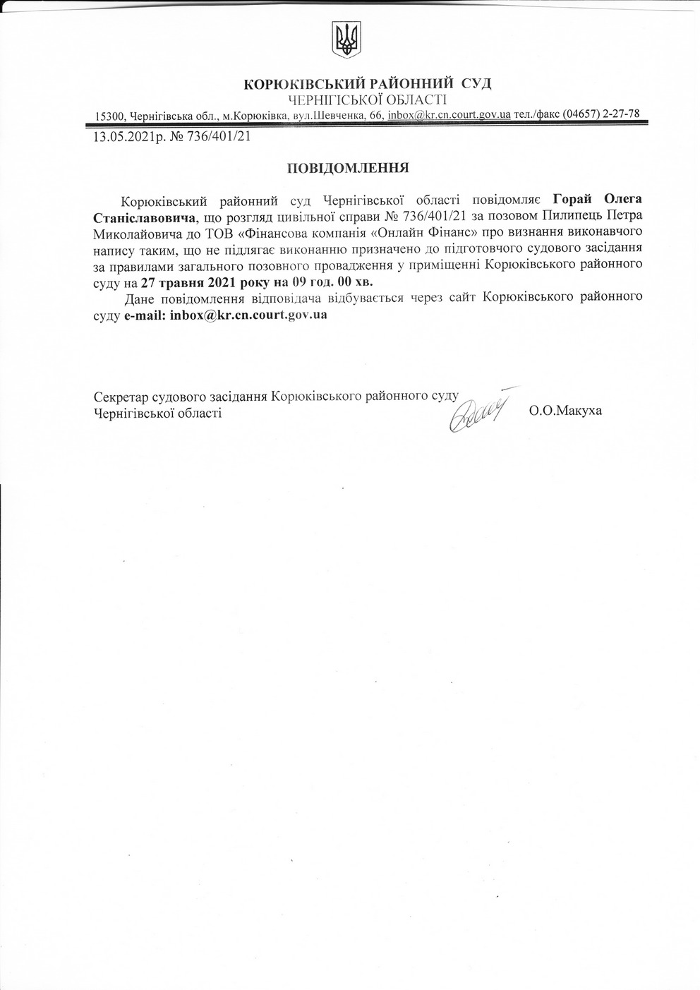 Повідомлення від 13.05.2021 про виклик до суду Горай Олега Станіславовича