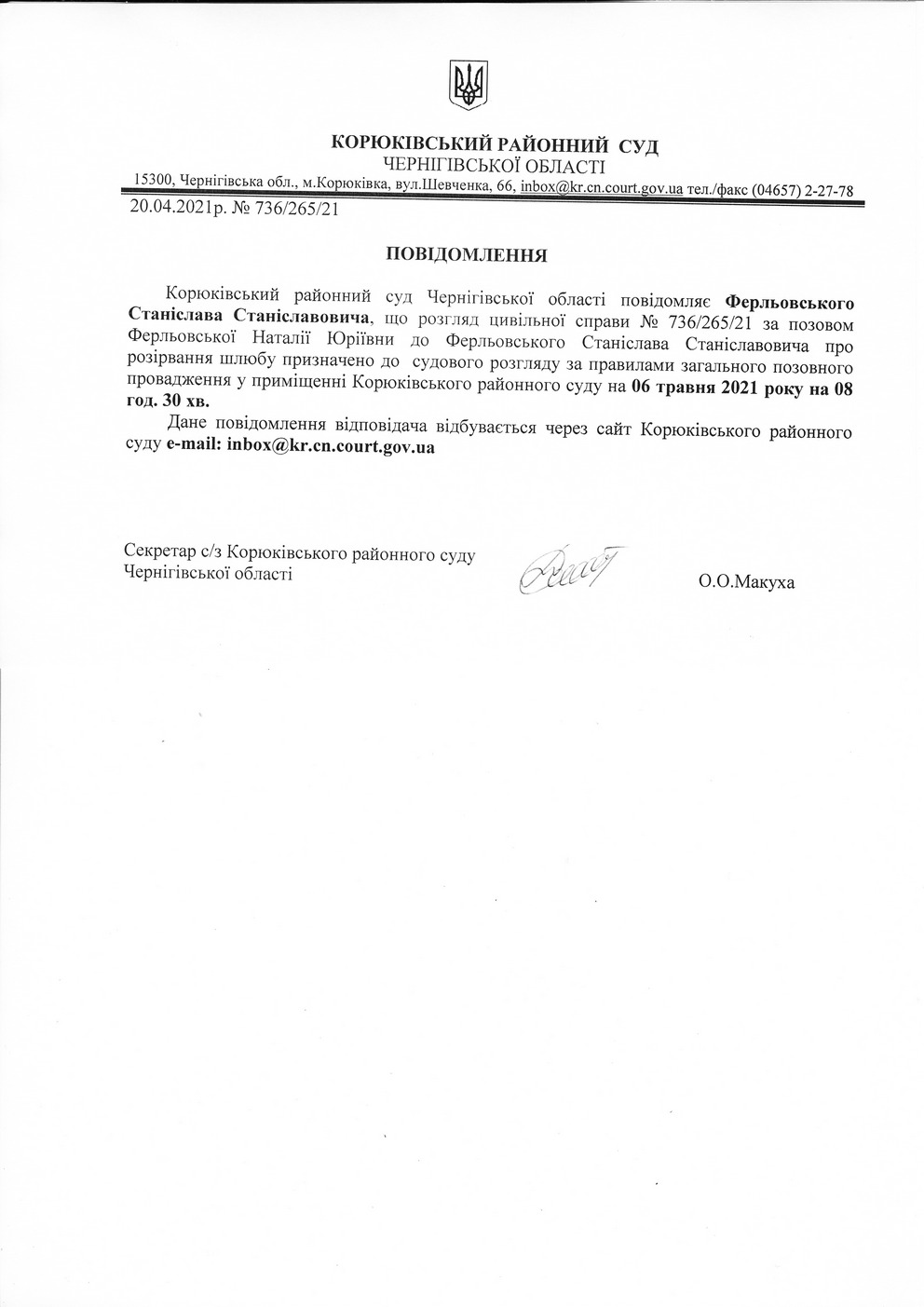Повідомлення від 20.04.2021 про виклик до суду Ферльовського Станіслава Станіславовича