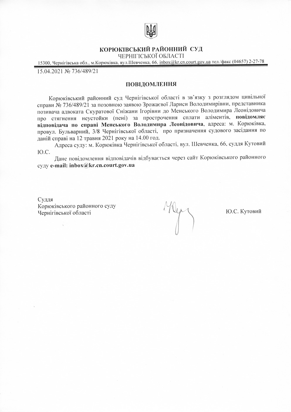 Повідомлення від 15.04.2021 про виклик до суду Менського Володимира Леонідовича