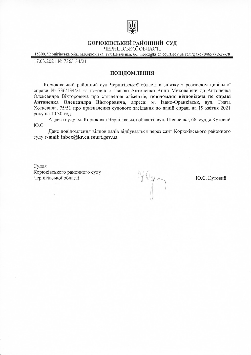 Повідомлення від 17.03.2021 про виклик до суду Антоненка Олександра Вікторовича