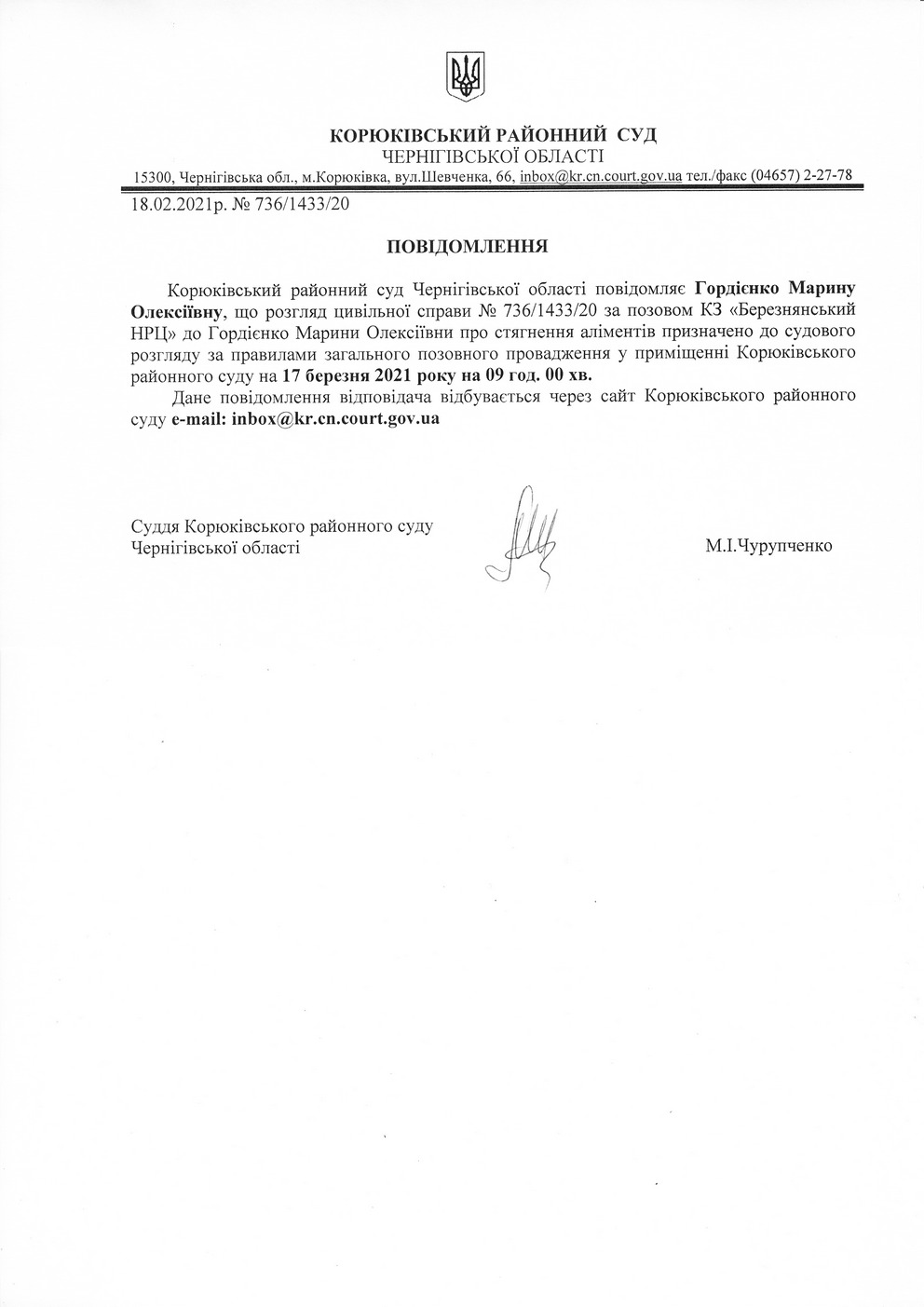 Повідомлення від 18.02.2021 про виклик до суду Гордієнко Марину Олексіївну