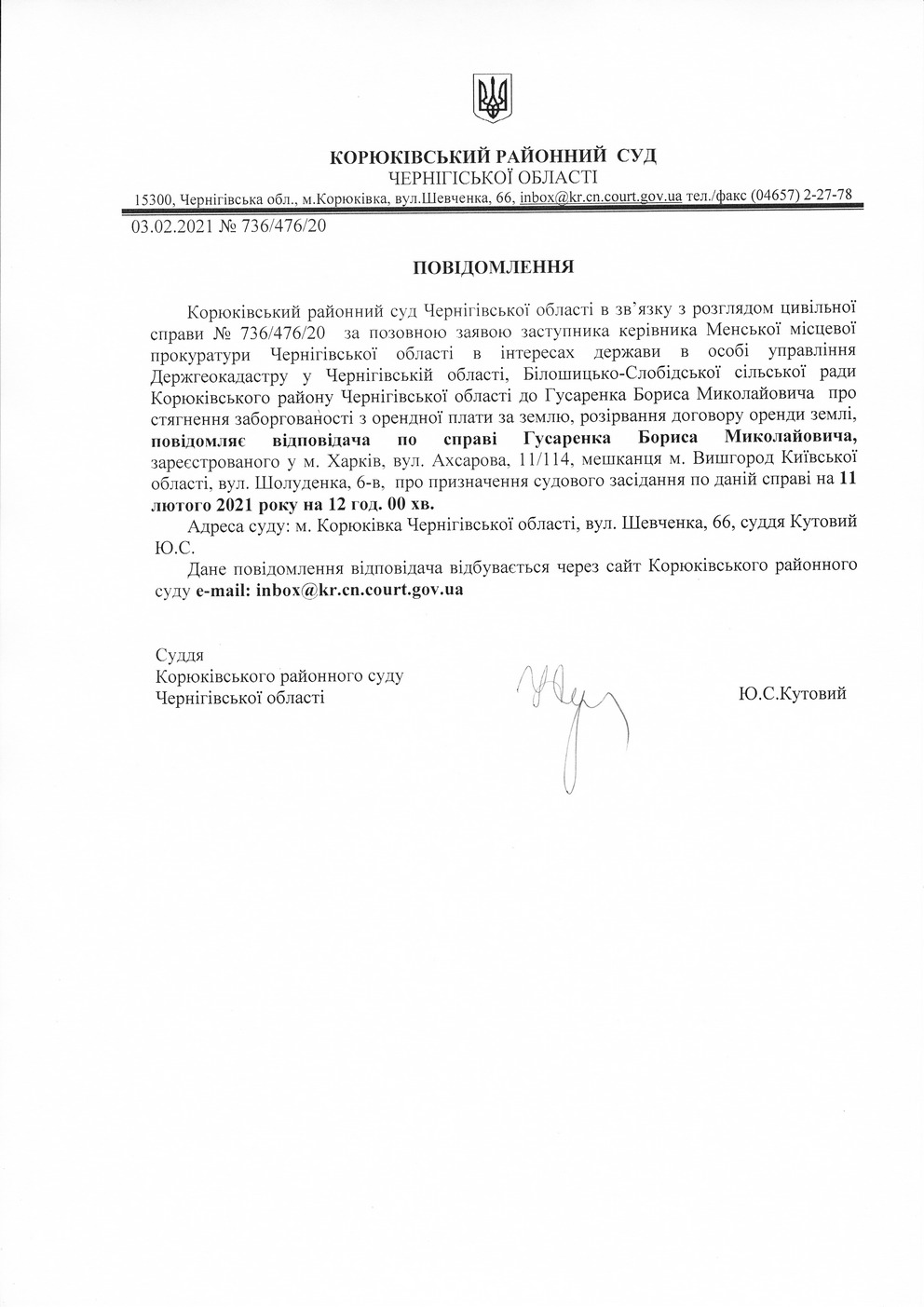 Повідомлення від 03.02.2021 про виклик до суду Гусаренка Бориса Миколайовича