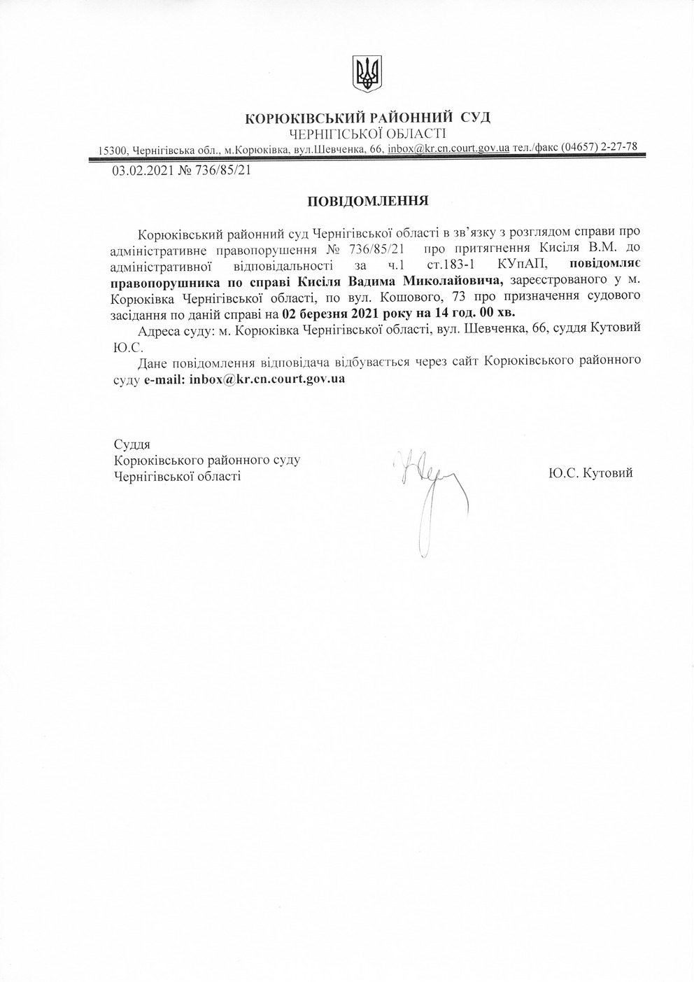 Повідомлення від 03.02.2021 про виклик до суду Кисіля Вадима Миколайовича