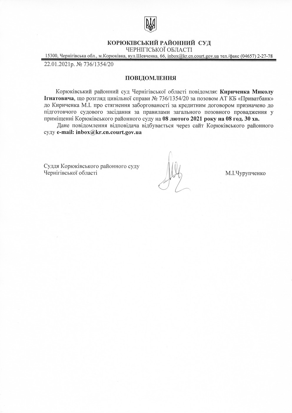 Повідомлення від 22.01.2021 про виклик до суду Кириченка Миколу Ігнатовича