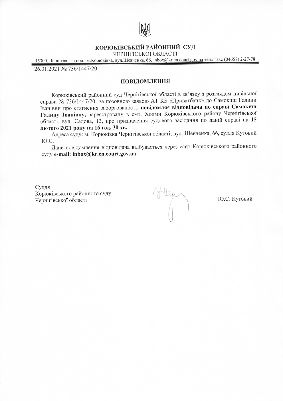 Повідомлення від 26.01.2021 про виклик до суду Самокиш Галину Іванівну