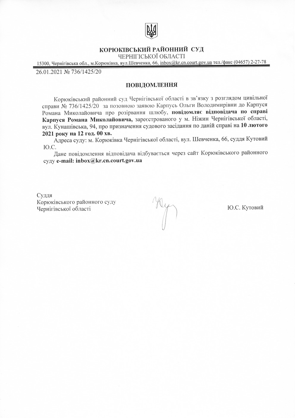 Повідомлення від 26.01.2021 про виклик до суду Карпуся Романа Миколайовича