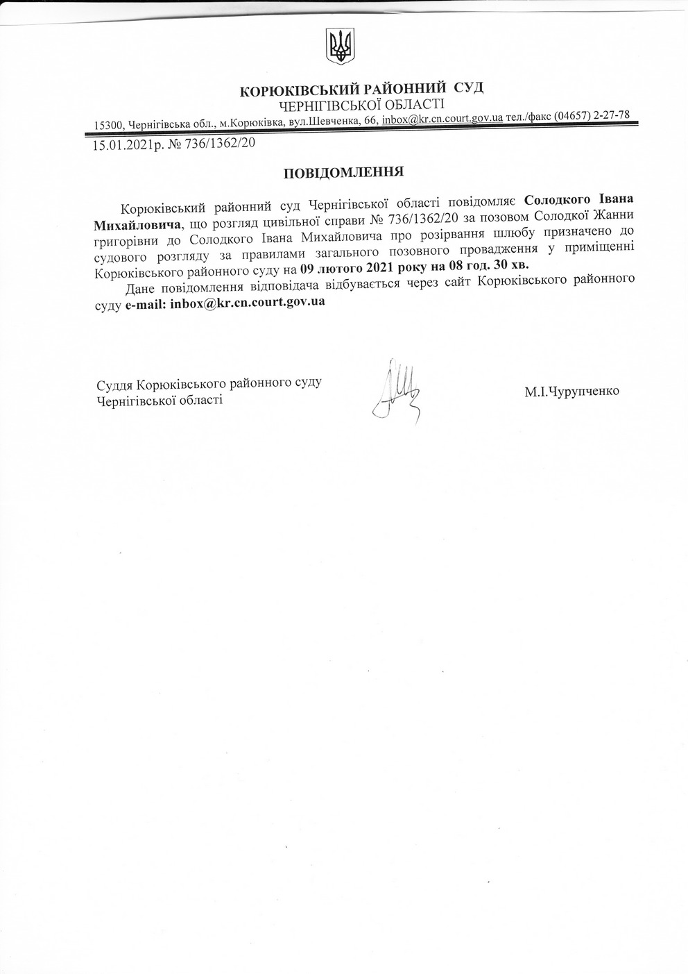 Повідомлення від 15.01.2021 про виклик до суду Солодкого Івана Михайловича