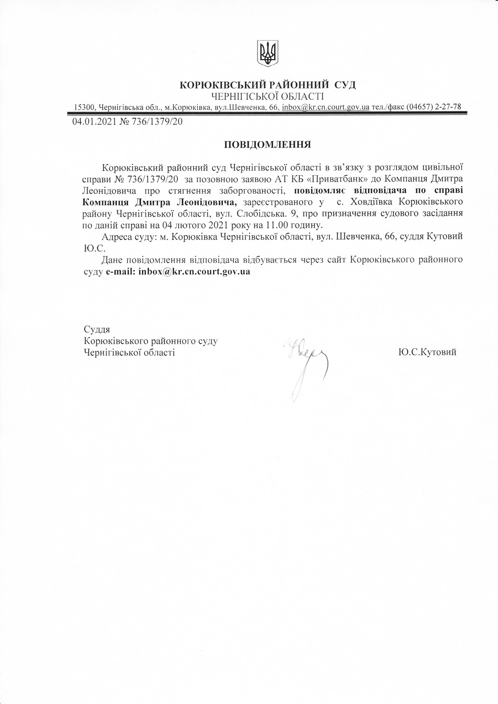 Повідомлення від 04.01.2021 про виклик до суду Компанця Дмитра леонідовича
