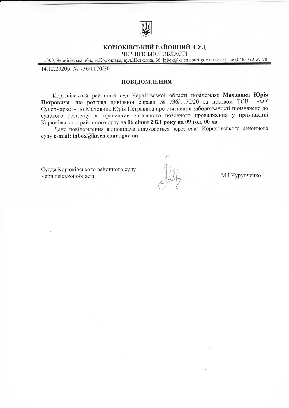 Повідомлення від 14.12.2020 про виклик до суду Маховика Юрія Петровича
