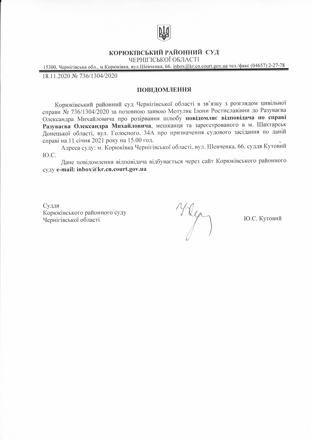 Повідомлення від 18.11.2020 про виклик до суду Разуваєва Олександра Михайловича
