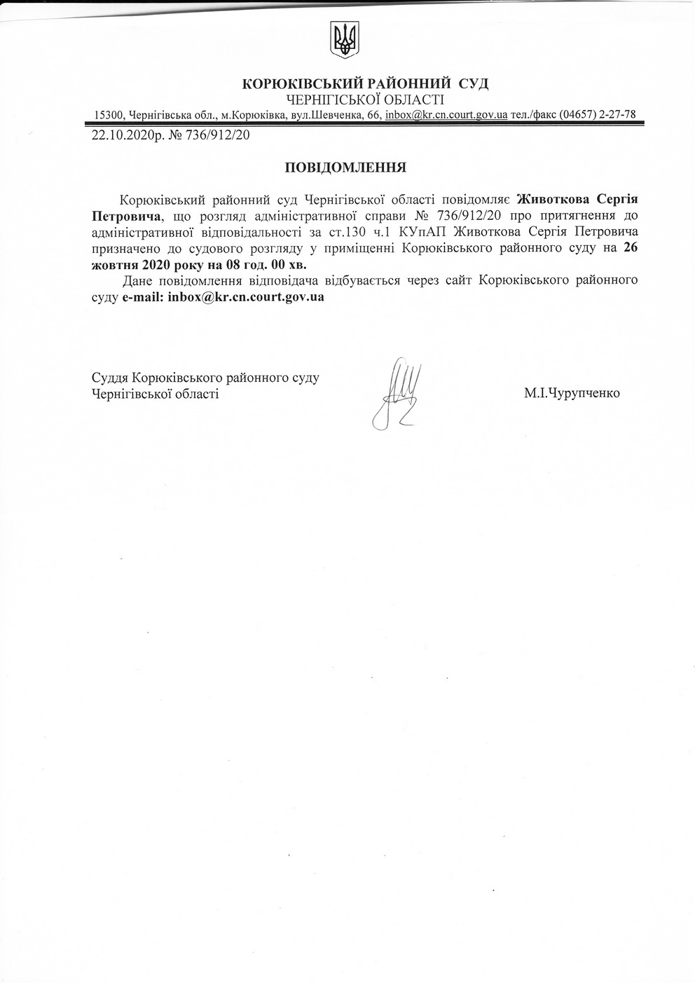 Повідомлення від 22.10.2020 про виклик до суду Животкова Сергія Петровича