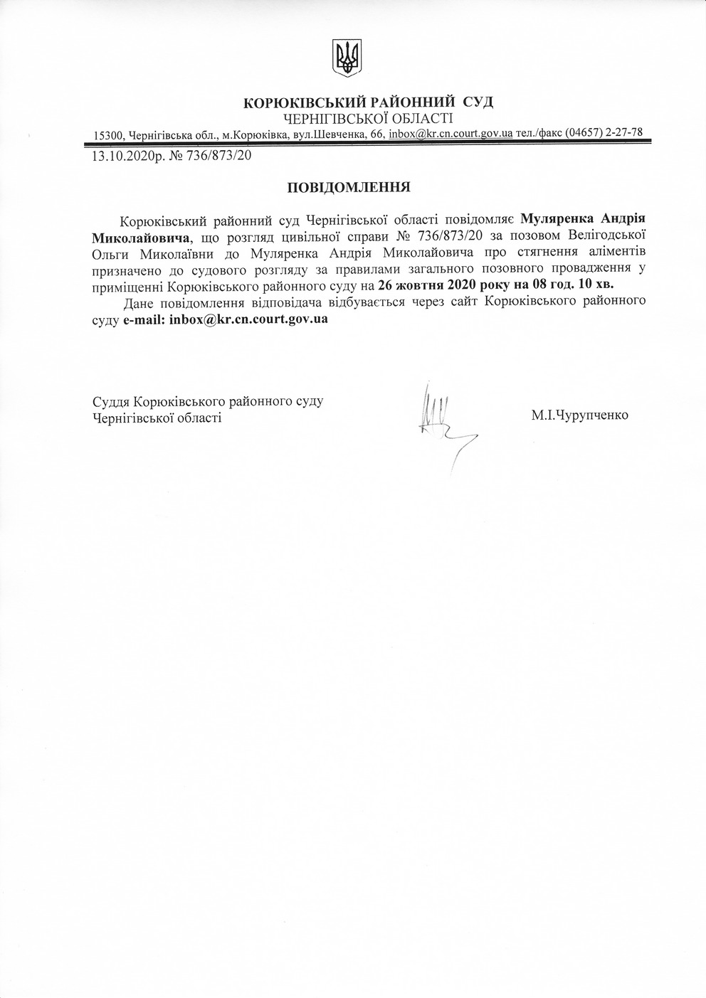 Повідомлення від 13.10.2020 про виклик до суду Муляренка Андрія Миколайовича