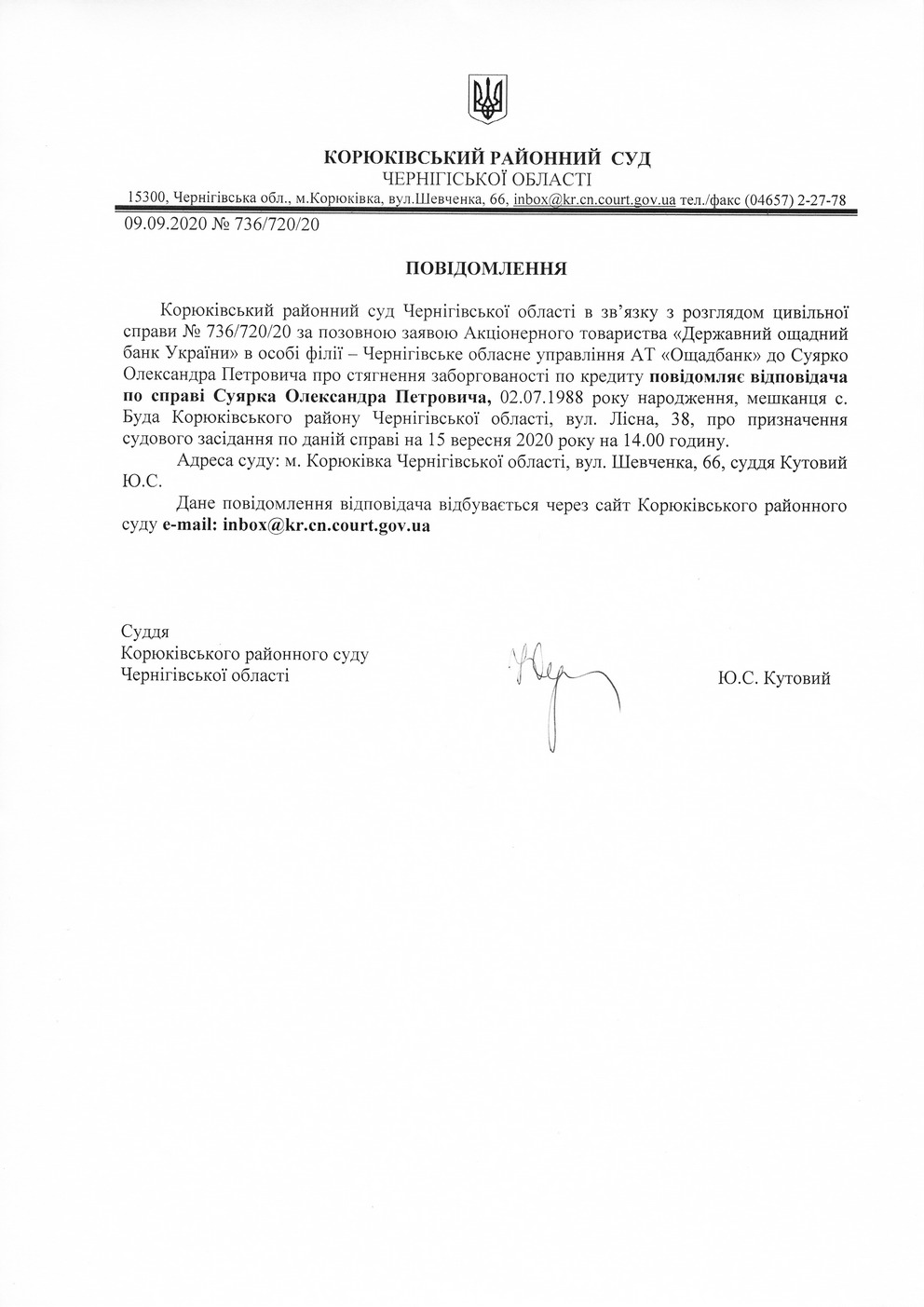 Повідомлення від 09.09.2020 про виклик до суду Суярка Олександра Петровича